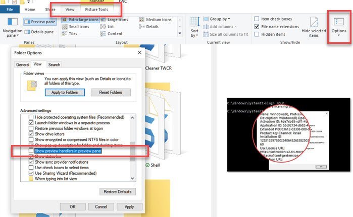 Ha engedélyezni szeretné az előnézeti ablaktáblát a Fájlkezelőben, lépjen a Beállítások elemre, válassza a Nézet lapot, és győződjön meg arról, hogy az „Előnézeti kezelők megjelenítése az előnézeti ablaktáblában” jelölőnégyzet be van jelölve. Ez lehetővé teszi a fájlok előnézetét a panelen.