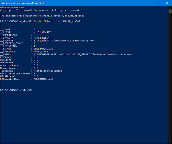 Ha elkészült, egy listát fog kapni az eredményekről, amelyek megmutatják, hogy a rendszer milyen jól teljesít. A parancs pontszámot ad a rendszerben lévő CPU-ra, GPU-ra, lemezre és memóriára.