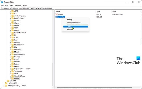 - Rendszerleíró adatbázis módosítása – Törölje az Ubisoft Launcher kulcsot (ha van)
