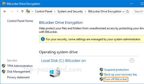 - Fare clic suDisattiva BitLockerlink dove appare accanto all'unità.