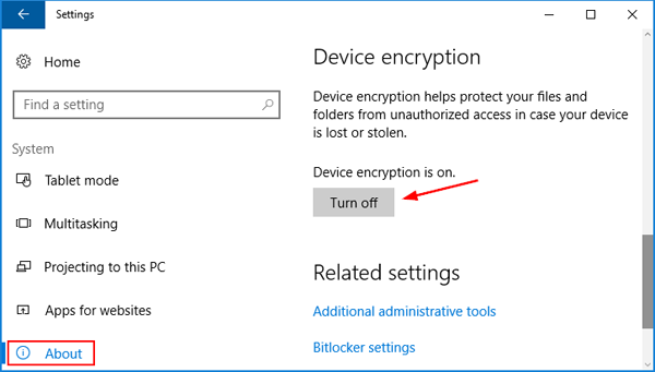 - ClicDisul lato sinistro. Dal lato destro, scorri verso il basso fino aCrittografia del dispositivosezione e fare clicSpegnerepulsante.