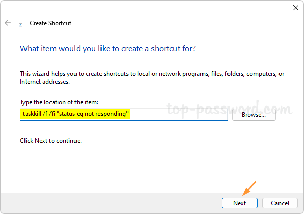 - Digitare il seguente comando nella casella di testo e fare clicProssimo.