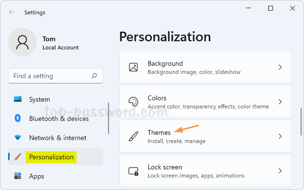 - L'app Impostazioni si aprirà nella pagina Personalizzazione. Fare clic suTemicategoria nel riquadro di destra.