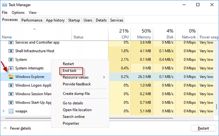Passaggio 1: in Gestione attività,fare clic con il pulsante destro del mousesu Esplora risorse e selezionaTermina l'attività.