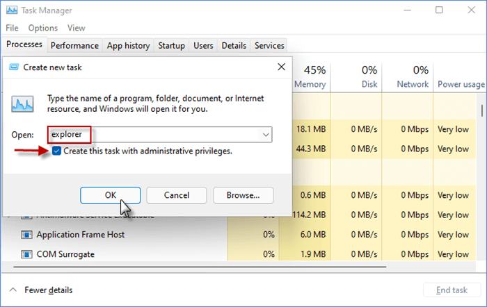Passaggio 3: digitareesploratorenella finestra delle attività e accetta la voce "Crea questa attività con privilegi di amministratore". Quindi fare clic suOKper vedere se è possibile aprire Esplora file.