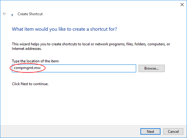 Quando si apre la procedura guidata Crea collegamento, digitarecompmgmt.mscnella casella della posizione del collegamento e fare clic su Avanti.