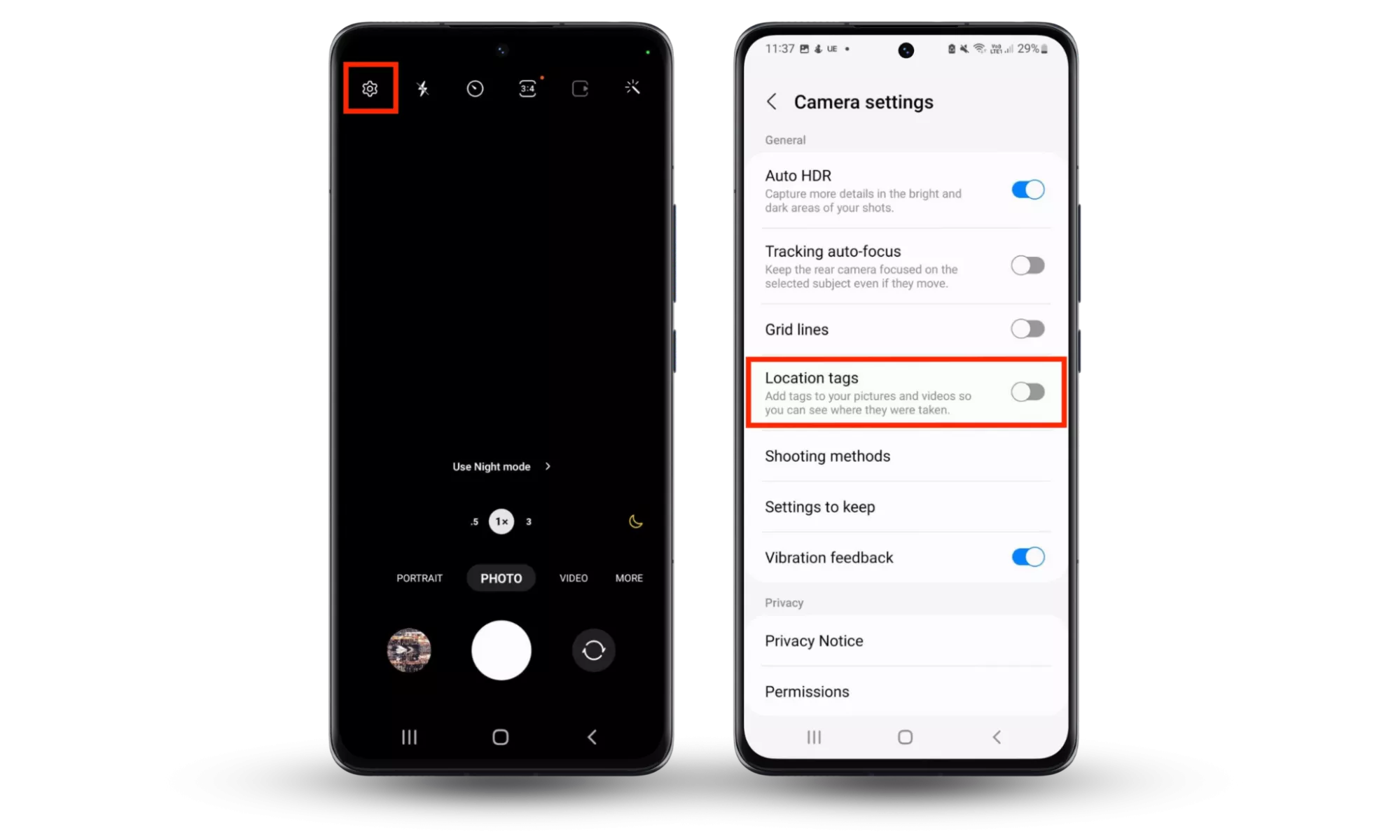 Passaggio 1-2. Tocca l'icona a forma di ingranaggio nell'angolo in alto a sinistra dello schermo, quindi disattiva i tag di posizione.3. Gestione dei dati sulla posizione