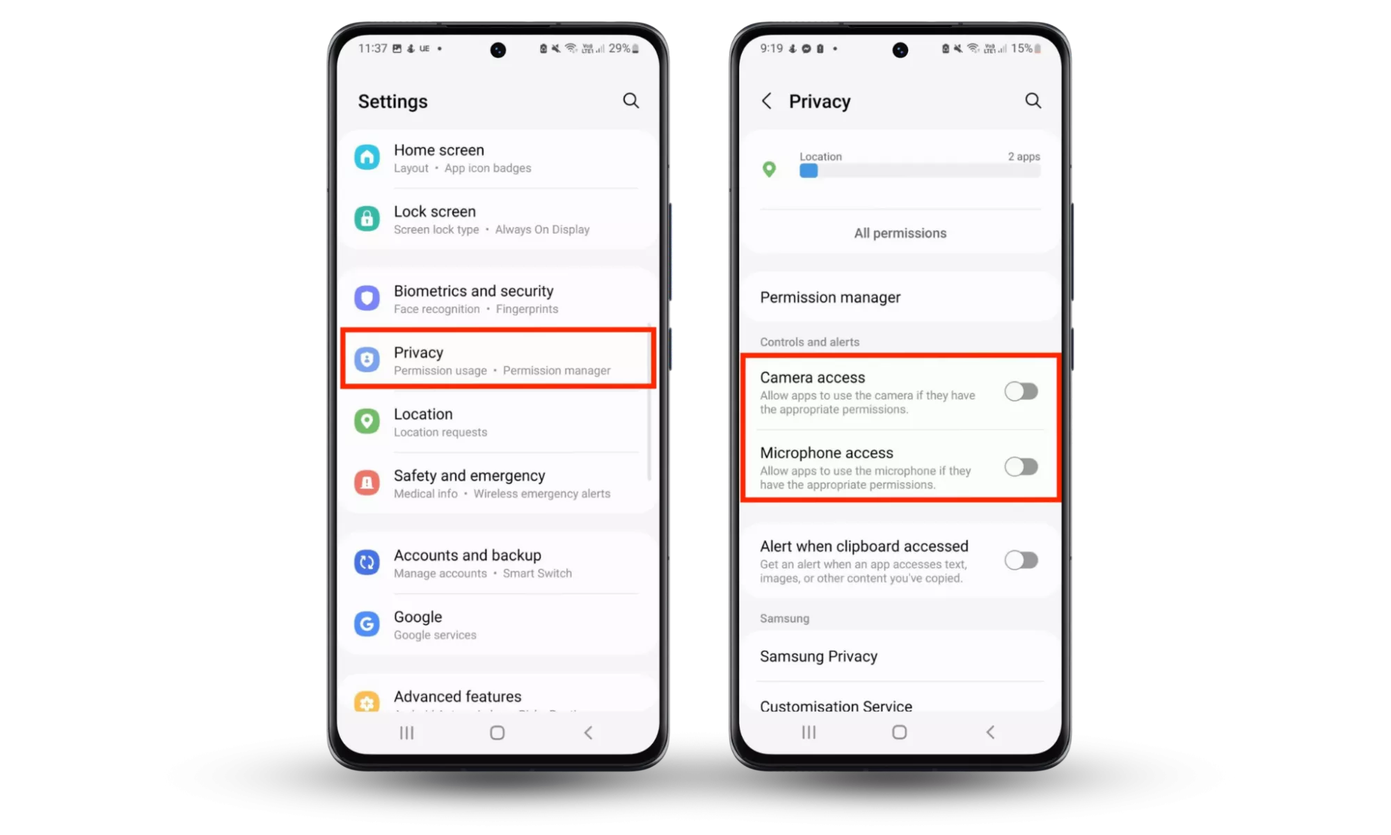 Passaggio 2-3. Seleziona Privacy > Disattiva l'accesso alla fotocamera e l'accesso al microfono.In alternativa, come mostrato sopra, puoi disattivare le autorizzazioni della fotocamera e del microfono per ciascuna app.