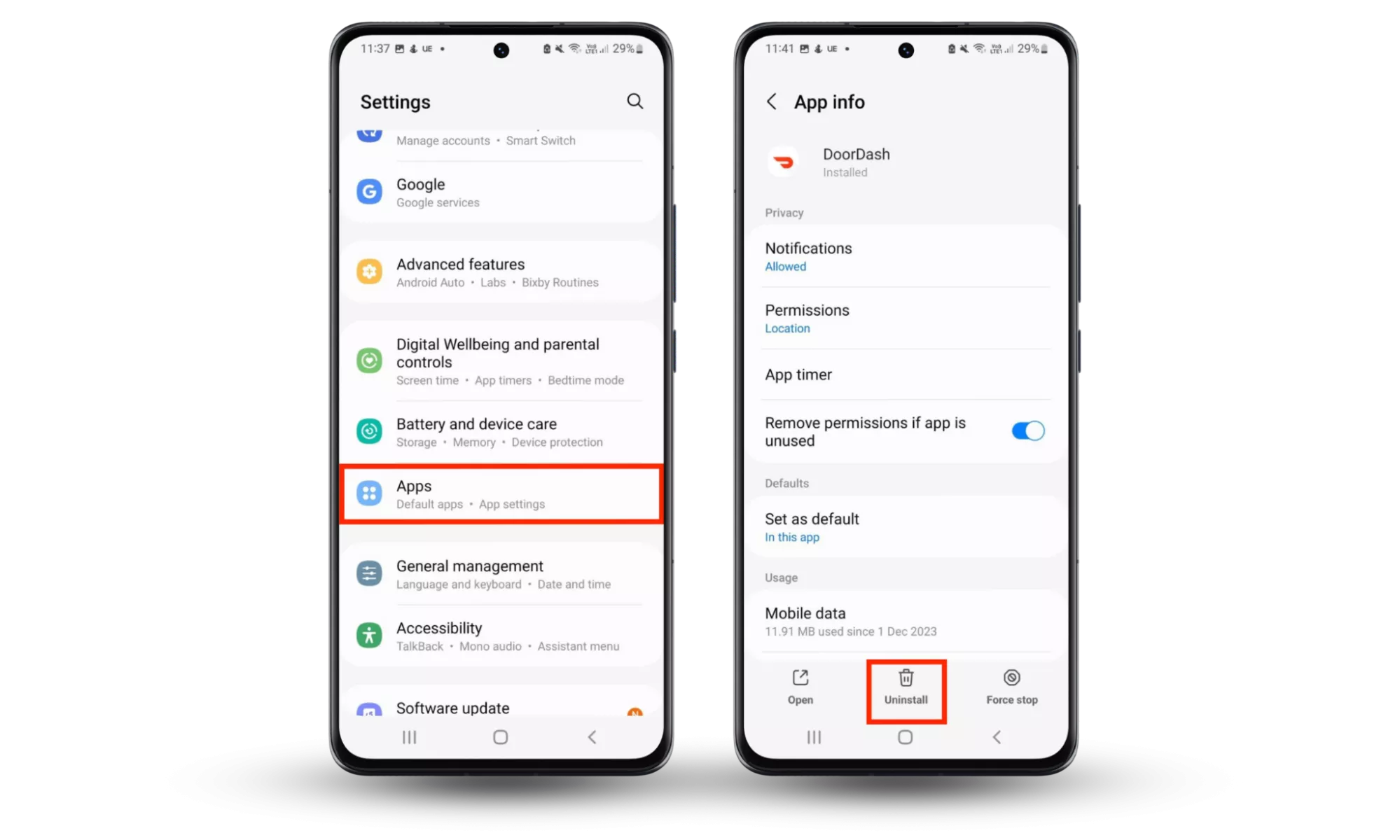 Passaggio 1-2. Seleziona App, scegli un'app e premi Disinstalla.4. Disattiva le autorizzazioni dell'app