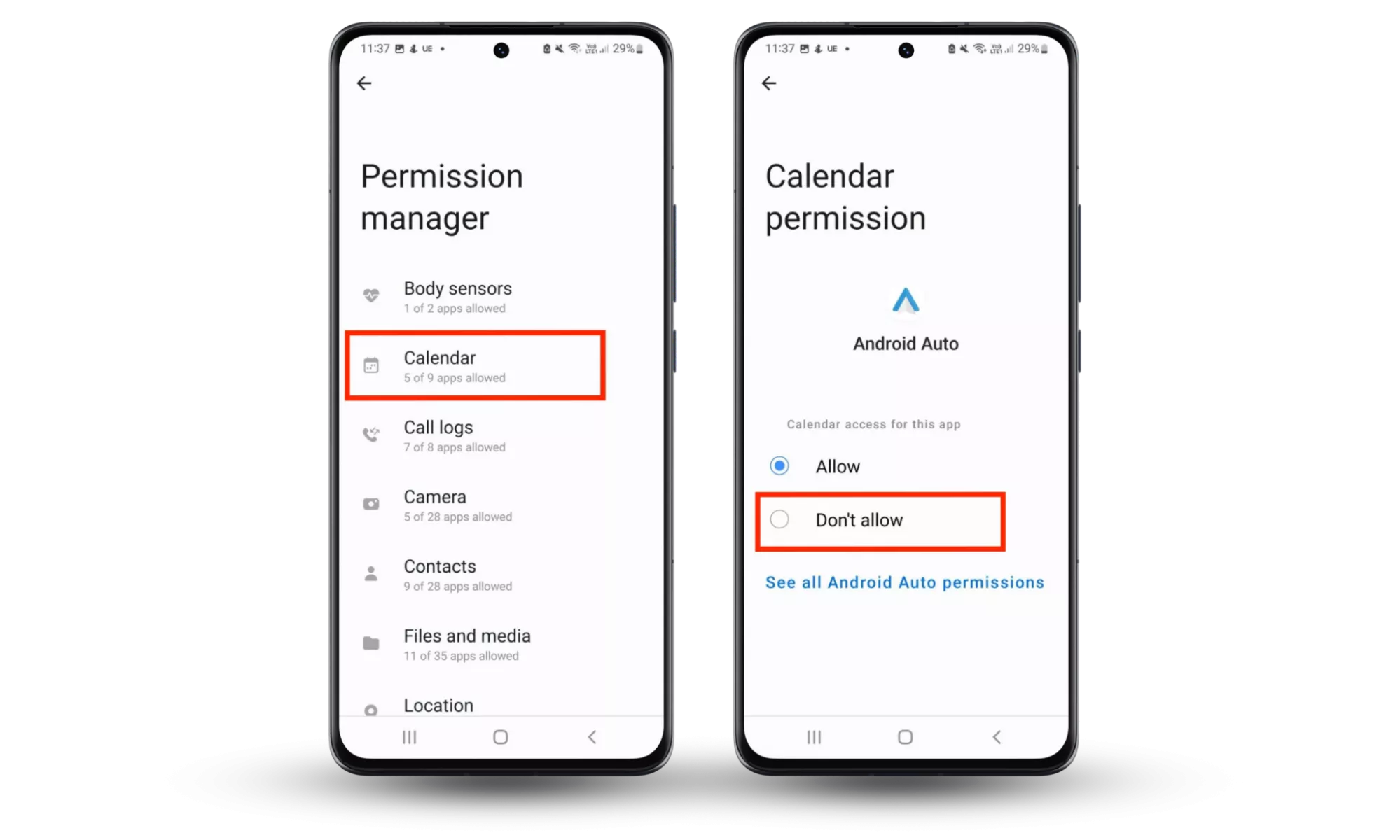 - Seleziona ciascuna categoria (Calendario, Fotocamera, Registro chiamate, ecc.) e controlla quali app hanno accesso a tali autorizzazioni. Successivamente, rimuovi le autorizzazioni per ogni app che non le richiede o non dovrebbe averle in primo luogo.