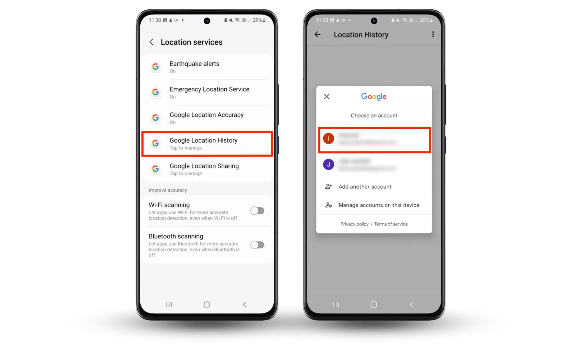Passaggio 3-4. Seleziona Cronologia delle posizioni Google, quindi scegli il tuo account Google.