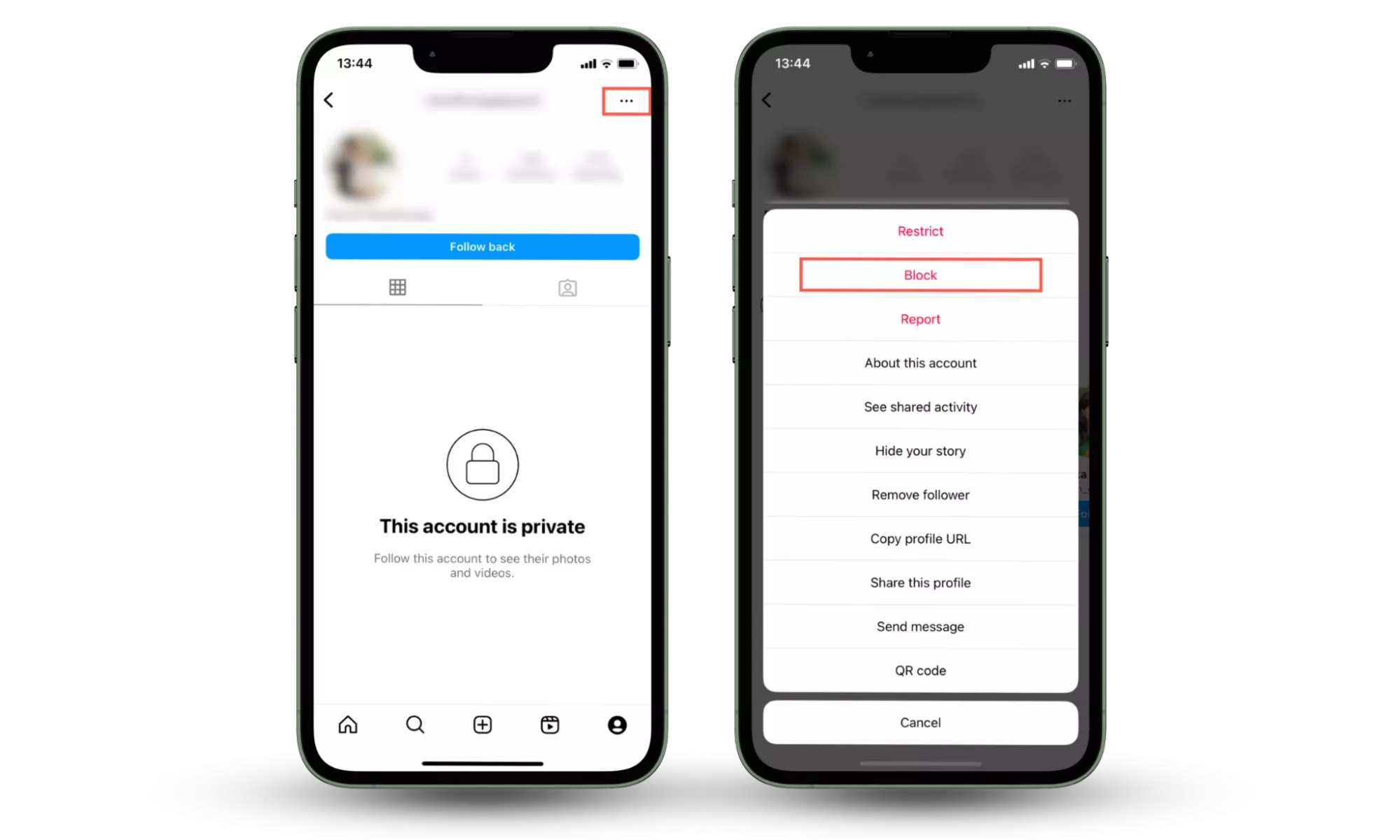 Passaggi 4-5: tocca l'icona Altro sulla pagina di un profilo falso e seleziona Blocca per bloccarlo.Nota