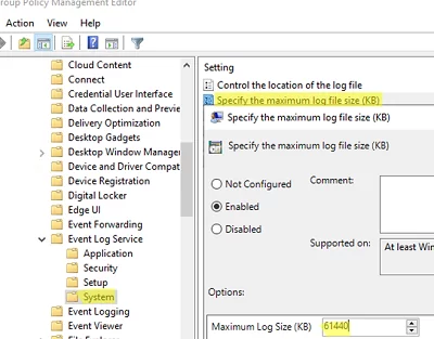 Event Viewer The Maximum Log Size specified is not valid. It is too large or too small. The Maximum Log Size will be set to the following: 61440 KB