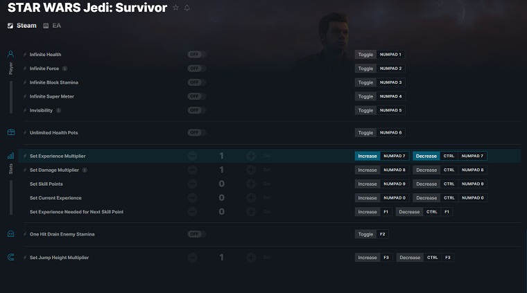 WeModè il miglior cheat trainer che puoi scaricare per attivare forze illimitate nei giochi. WeMod Trainer offre 13 opzioni cheat in Star Wars Jedi: Survivor. Non importa se stai giocando a Steam o a un gioco non Steam, WeMod supporta entrambi. Non è necessario spendere un centesimo per attivare alcun trucco.