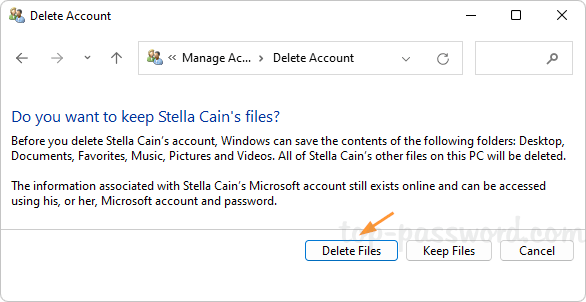 - La finestra successiva ti chiederà se desideri mantenere la cartella del profilo per il tuo account Microsoft. Se non vuoi conservare nulla memorizzato nella cartella del profilo, fai semplicemente clic su "Elimina filepulsante ".
