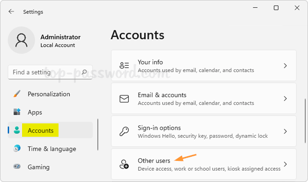 - Premere ilFinestretasto +IOper aprire l'app Impostazioni. ScegliereAccountnella barra laterale sinistra e fare clic su "Altri utenti" a destra.