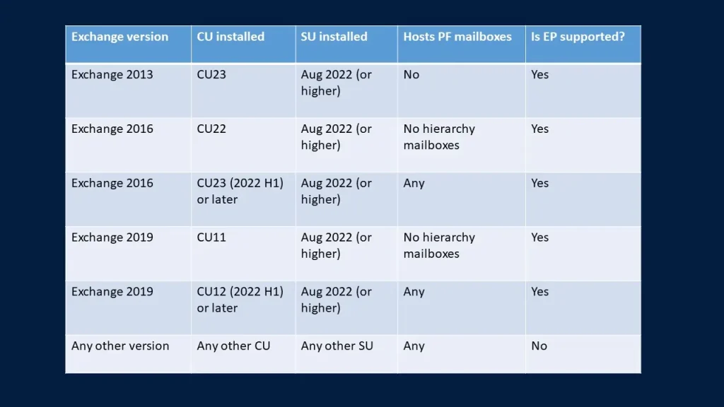 Per Exchange 2013, è necessario essere in esecuzione suCU 23 con agosto 2022 SUo più tardi.