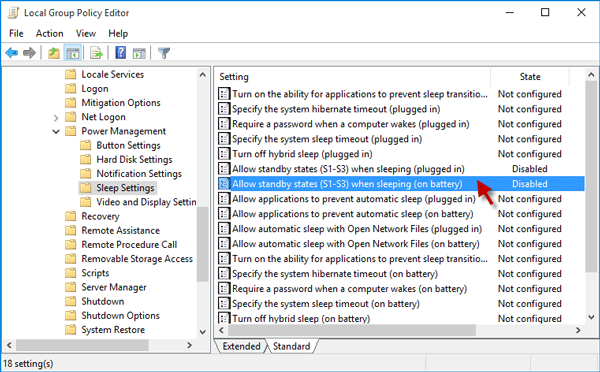 Passaggio 5: vai aConfigurazione del computer>Modelli amministrativi>Sistema>Gestione dell'energia>Impostazioni del sonno. Con le Impostazioni di sospensione selezionate, individuare "Consenti stati di standby (S1-S3) durante la sospensione (collegato)" e "Consenti stati di standby (S1-S3) durante la sospensione (con batteria)". Fare doppio clic su ciascuno di essi.