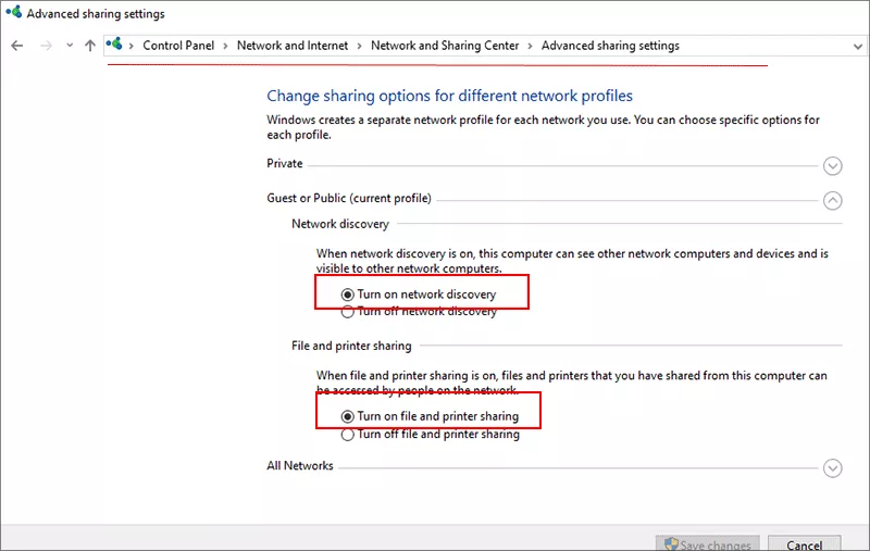 Passaggio 3:AbilitareAttiva l'individuazione della reteEcondivisione di file e stampanti. Inoltre, dovresti assicurarti che entrambi i PC siano sulla stessa rete. Se necessario, riconfigurare le autorizzazioni della cartella condivisa.