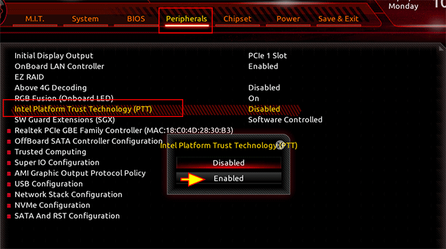 Passaggio 8:Sono disponibili più impostazioni avanzate. Basta andare a fare clicPeriferichee poi fare doppio clicTecnologia Intel Platform Trust (PPT). Successivamente, fare clic suAbilitatopulsante. (Suggerimento: in alcuni computer, la tecnologia Intel Platform Trust potrebbe essere modificata in Dispositivo di sicurezza, Supporto dispositivo di sicurezza, Stato TPM, Switch AMD fTPM, AMD, PSP fTPM o Intel PPT)