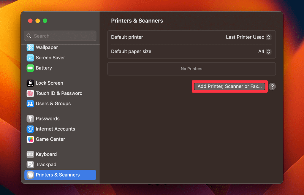 Per fare in modo che il tuo Mac riconosca la tua stampante, collegala tramite USB, Ethernet o Wi-Fi. Vai aImpostazioni di sistema, selezionaStampanti e scannere fare clic suAggiungi stampante, scanner o fax...pulsante per aggiungere una nuova stampante. Il tuo Mac dovrebbe rilevare e visualizzare automaticamente le stampanti disponibili. Seleziona la tua stampante e segui le istruzioni per completare la configurazione.