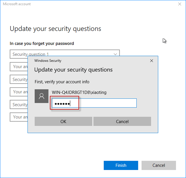 Passaggio 4: se la password inserita è corretta, ora puoi aggiungere o aggiornare le tue domande di sicurezza. Scegli la domanda che desideri e inserisci la tua risposta. Richiede di scegliere tre domande e di rispondere. Successivamente, fai clic su Fine.
