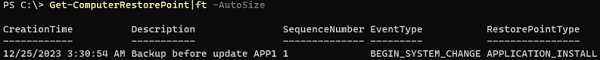 Checkpoint-Computer -description "Checkpoint before update video driver" -RestorePointType "APPLICATION_INSTALL"