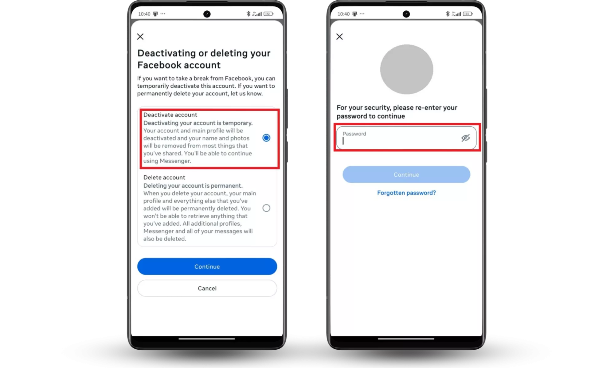 Passaggio 9-10: selezionare Elimina account > toccare Continua > Scegli motivo (facoltativo) > Continua di nuovo5. Sbarazzati di Facebook da Android