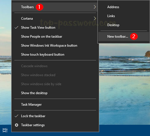 È sufficiente fare clic con il pulsante destro del mouse su uno spazio vuoto sulla barra delle applicazioni di Windows, quindi selezionareBarre degli strumenti->Nuova barra degli strumenti.