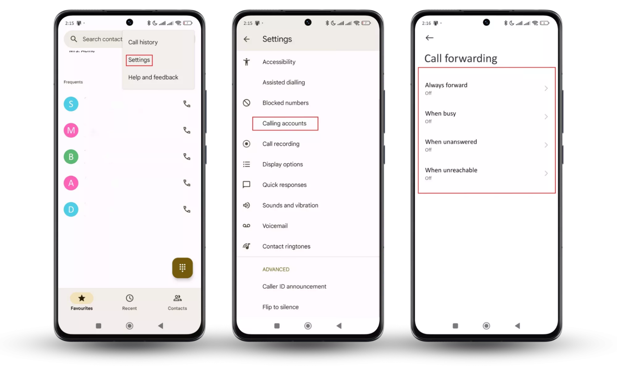 Passaggi da 1 a 7: tocca l'icona del menu a tre punti o Altro > Seleziona Impostazioni o Impostazioni chiamate > Tocca Account di chiamata (per SIM doppie) > Tocca Inoltro chiamate > Assicurati che tutte le opzioni di inoltro (ad esempio, Inoltra sempre, Inoltra se occupato, Inoltra se senza risposta, Inoltra quando irraggiungibile) siano disattivate.11. Ripristinare le impostazioni di fabbrica (se necessario)