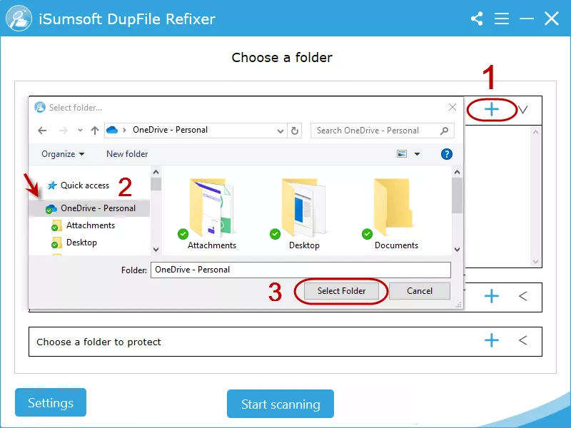 Passaggio 1: in iSoft DupFile Refixer, fare clic suAggiungi iconaper scegliere OneDrive o una delle sue cartelle da scansionare.
