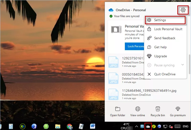 Passaggio 1: fare clic sull'icona OneDrive nella barra delle applicazioni e fare clic suingranaggiopulsante per scegliereImpostazioni.