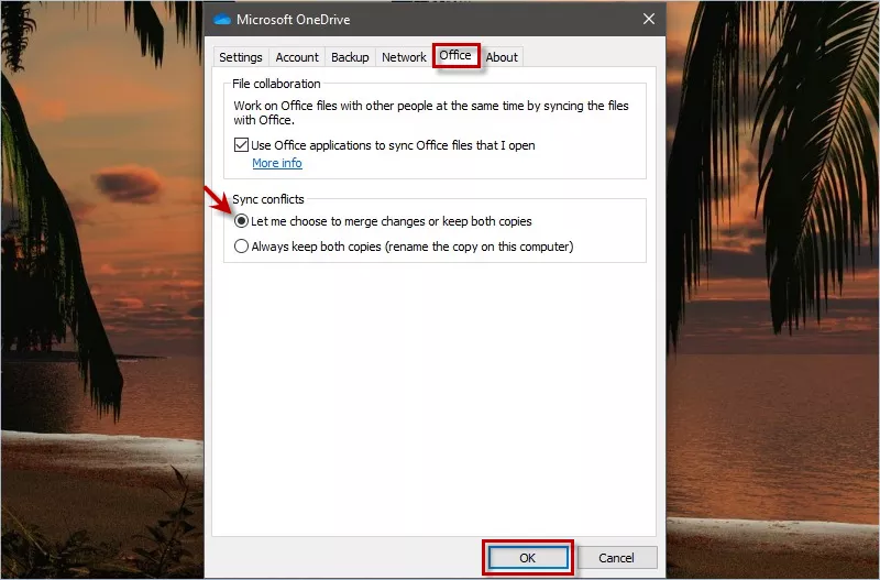 Passaggio 2: scegliUfficioscheda e abilitareFammi scegliere se unire le modifiche o conservare entrambe le copie.Infine fare clicOK.