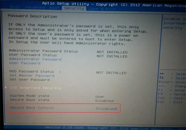 - NelSicurezzamenu, utilizzare i tasti freccia sulla tastiera per selezionare il fileControllo di avvio sicuroopzione. Premere Invio per impostarloDisabilitato.