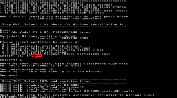 - Con la partizione di sistema selezionata, l'utilità richiede quindi di specificare la directory del registro da modificare. L'impostazione predefinita va bene, quindi premi Invio.