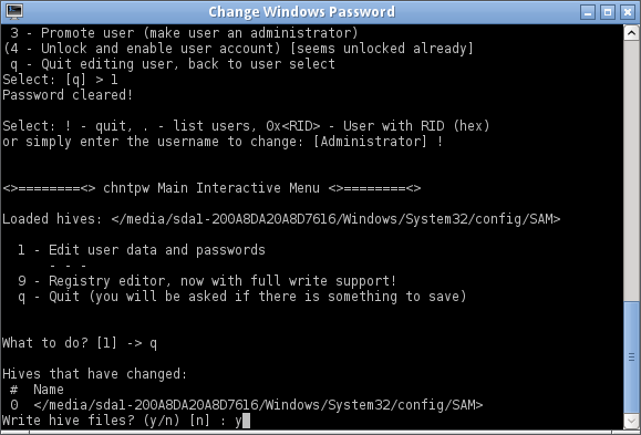 - Ti verrà ora presentato il menu interattivo principale di chntpw. Tipo1e premere Invio.