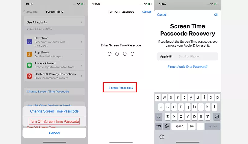 Recupero del passcode del tempo di utilizzo. Se è stato fornito l'ID Apple, puoi utilizzarlo per ripristinare quello dimenticato