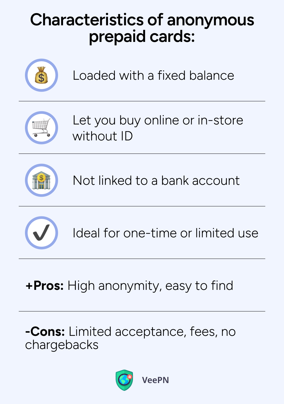 Utilizza una carta prepagata acquistata in contanti in un negozio o una carta virtuale legata a un servizio di pagamento mascherato come Privacy.com. Questi non si collegano alla tua identità, ma non puoi usarli con il tuo vero nome o su account legati alla tua identità. Per una maggiore privacy, utilizza una VPN e un masterizzatore e-mail durante gli acquisti online.
