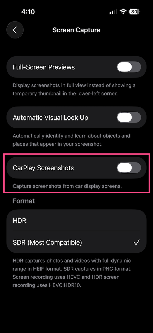 Questo è tutto! Una volta disabilitato, il tuo iPhone non salverà più gli screenshot dello schermo della tua auto nella tua libreria di foto.