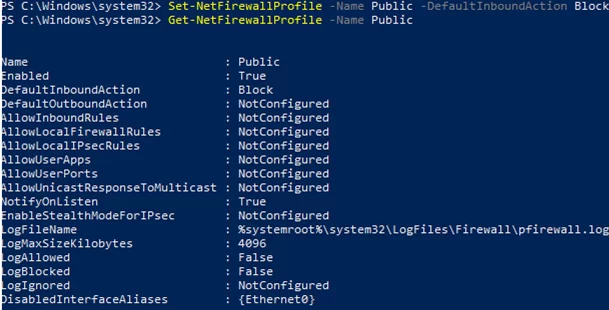 Set-NetFirewallProfile –Name Public –DefaultInboundAction Block