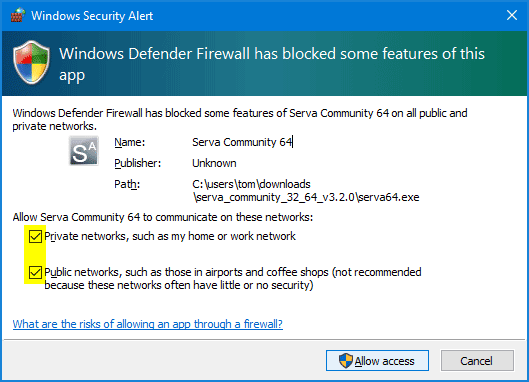 - Se il firewall di Windows visualizza un messaggio denominato Avviso di sicurezza Windows, chiedendoti di consentire a Serva di accedere alla rete, fai clic suConsenti accesso.