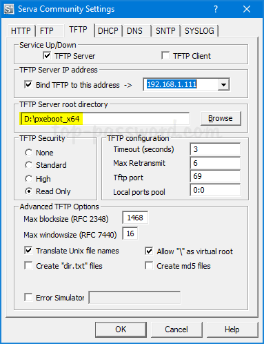 - Nella finestra Impostazioni Serva, fare clic sulla scheda TFTP. Tic tacServer TFTPe imposta la directory root sulla cartella in cui hai estratto il file pxeboot_x64.zip (nel mio caso D:\pxeboot_x64). Controlla ilConsenti "\" come root virtualeopzione.