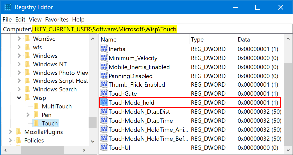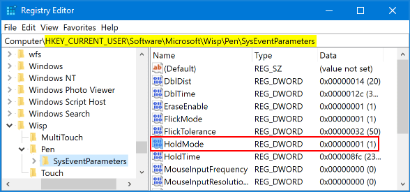 Se desideri anche attivare/disattivare la funzionalità di pressione prolungata per fare clic con il pulsante destro del mouse su una penna touch, apri l'Editor del Registro di sistema e vai a:HKEY_CURRENT_USER\Software\Microsoft\Wisp\Pen\SysEventParameters, quindi modificare il fileHoldModevalore (1: attiva; 3: disattiva).