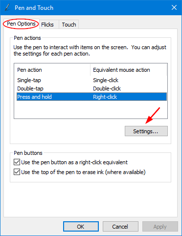 Si aprirà la finestra di dialogo Penna e tocco. Seleziona uno dei dueOpzioni pennascheda oToccoscheda. Una volta cheTieni premutol'opzione è evidenziata nell'elenco, fare clic suImpostazioni.