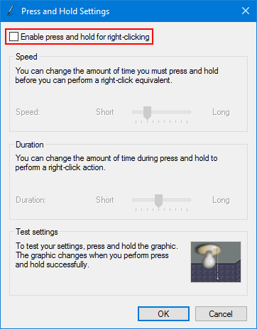Nella finestra Impostazioni pressione prolungata, seleziona o deseleziona la casella "Abilita la pressione prolungata per fare clic con il pulsante destro del mouse" e fare clic suOK.