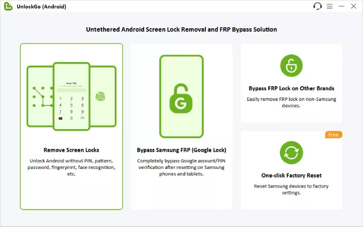 In queste circostanze, gli approcci convenzionali come il ripristino delle impostazioni di fabbrica potrebbero comportare la perdita di dati o potrebbero essere poco pratici senza i dettagli iniziali dell'account. UnlockGo Android affronta queste problematiche offrendo un'interfaccia intuitiva che assiste gli utenti durante tutta la procedura di sblocco. Questa guida spiegherà come bypassare il blocco dello schermo e il FRP tramite UnlockGo per Android.