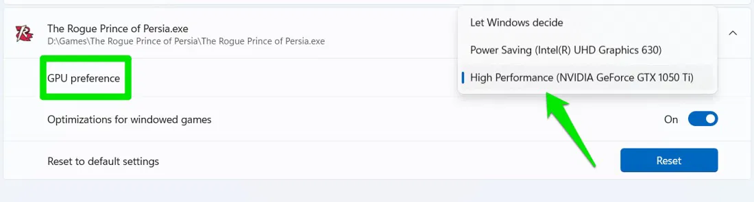 Successivamente, selezionaAlte prestazioninelPreferenza GPUdel gioco che hai appena aggiunto. Ripeti i passaggi per tutti i giochi per assicurarti che utilizzino la GPU dedicata.