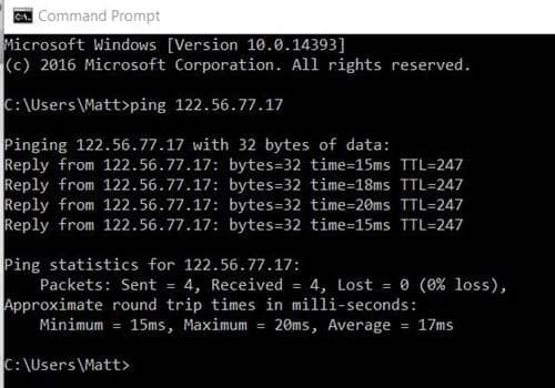 Molti di noi hanno familiarità con il comando Ping, ampiamente utilizzato per testare i problemi di connessione di rete. Innanzitutto, apri un prompt dei comandi e inserisci il comando Ping, quindi inserisci il nome o l'indirizzo IP dell'host. La dimensione dei pacchetti verrà inviata sulla prima riga e la risposta di ciascun pacchetto verrà mostrata nelle quattro righe successive.