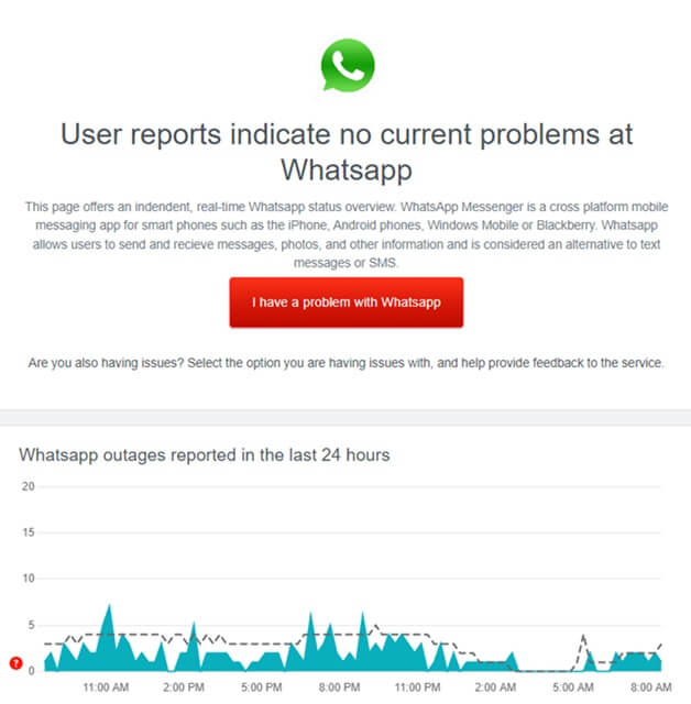 Per verificare se va tutto bene con il server WhatsApp o meno, puoi visitareDowndetector. Questo ti mostrerà se si sta verificando un'interruzione del server in questo momento.