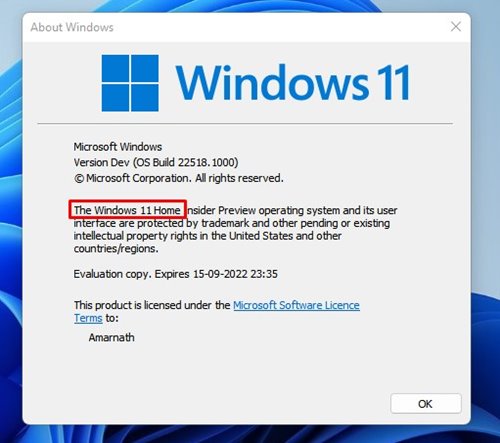 3. Si aprirà il pop-up Informazioni su Windows. Desideritrova la tua edizione di Windows 11Là.